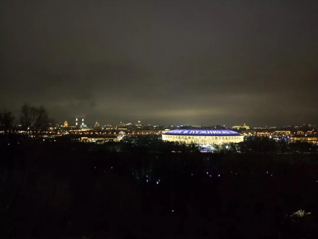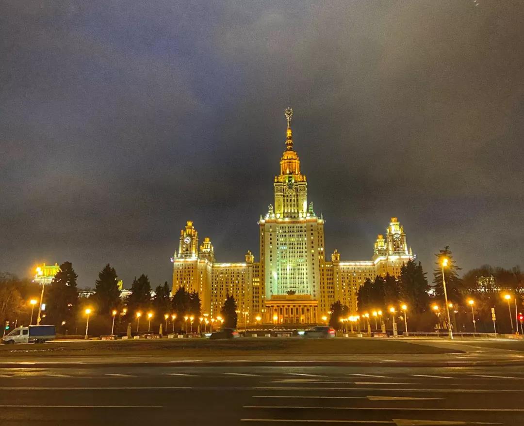 麻雀山頂極目遠(yuǎn)眺,望不盡繁華與典雅,巍巍白樺,裊裊浮云,熠熠燈火,在現(xiàn)代與古典中演繹著莫斯科的前世今生,有歷史的厚重感,有蒼生的寫實(shí)感,都在闌珊之際拓印出它應(yīng)有的輪廓。莫斯科國立大學(xué)莊嚴(yán)肅穆地聳立著,作為莫斯科七座斯大林式建筑之一,其大底座高尖頂?shù)奶厣滞庑涯浚谝鼓缓蜔艄獾妮x映下?lián)纹鹆藲鈩?,展現(xiàn)出最高學(xué)府的極度自信。