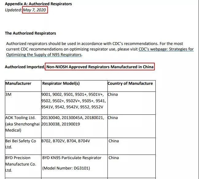 5月7日,美國FDA更新了針對(duì)中國生產(chǎn)的未獲NIOSH認(rèn)證的口罩獲得EUA授權(quán)的文件,獲得FDA認(rèn)可的中國生產(chǎn)的非NIOSH認(rèn)證的口罩只剩下14個(gè)廠家。