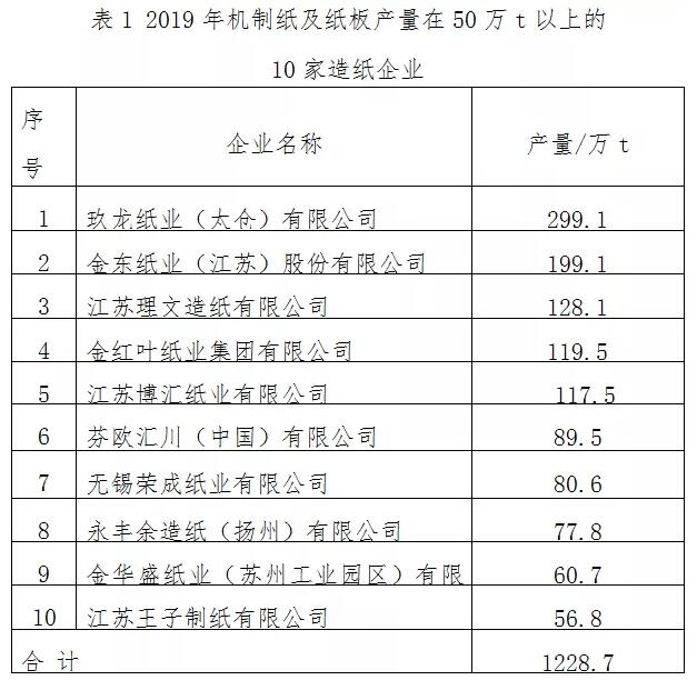 2019年江蘇省機(jī)制紙及紙板年產(chǎn)200萬t以上的企業(yè)有1家;年產(chǎn)100萬~200萬t的企業(yè)有4家;年產(chǎn)50萬~100萬t的企業(yè)有5家;年產(chǎn)10萬~50萬t的企業(yè)有10家。