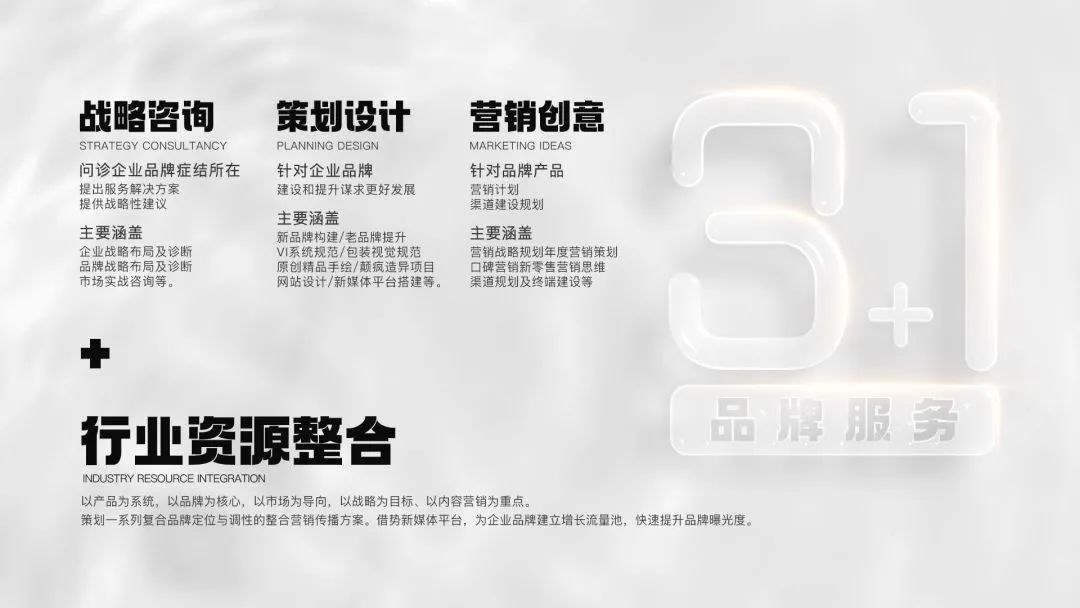 在一方品牌營(yíng)銷(xiāo)管理堅(jiān)持以品牌思維引領(lǐng)生活快消品行業(yè),致力于讓每個(gè)品牌更有價(jià)值,讓每個(gè)項(xiàng)目落到實(shí)處。“3+1品牌服務(wù)理念”精心打造戰(zhàn)略咨詢、策劃設(shè)計(jì)及營(yíng)銷(xiāo)創(chuàng)意三大核心板塊,加之整合行業(yè)產(chǎn)業(yè)鏈,以提供定制型全案服務(wù),驅(qū)動(dòng)品牌的市場(chǎng)價(jià)值,締造行業(yè)第一綜合型服務(wù)品牌!