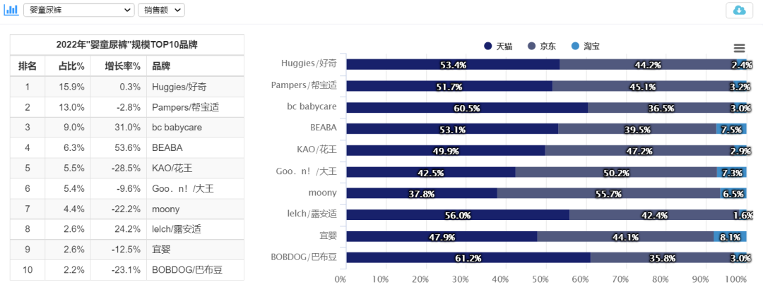 按照市場(chǎng)規(guī)模來(lái)看,2022年嬰童尿褲TOP10品牌分別為好奇、幫寶適、Babycare、碧芭寶貝(Beaba: )、花王、大王、Moony、露安適、宜嬰、巴布豆。