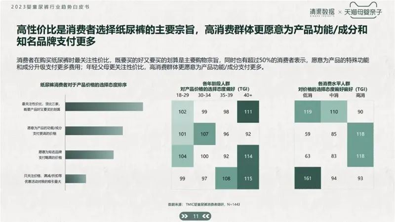 根據(jù)白皮書數(shù)據(jù)顯示,消費者在購買紙尿褲時最關(guān)注性價比,“又好又劃算”是主要購物宗旨,同時也有超過50%的消費者表示,愿意為產(chǎn)品的特殊功能和成分升級支付更多費用:年輕父母更關(guān)注性價比,高消費群體更愿意為產(chǎn)品功能/成分支付更多。