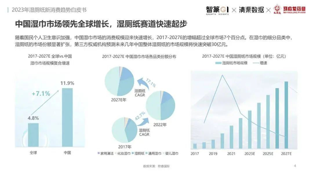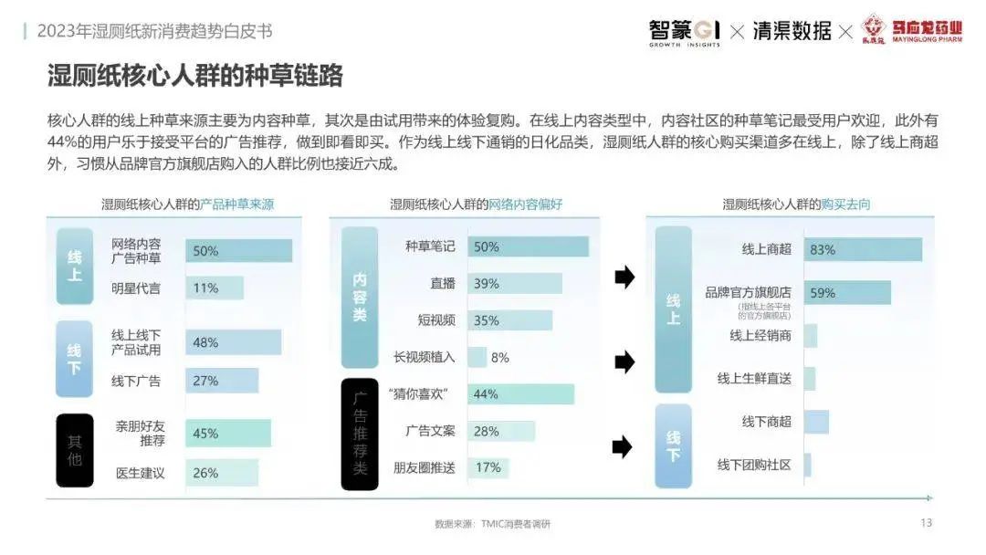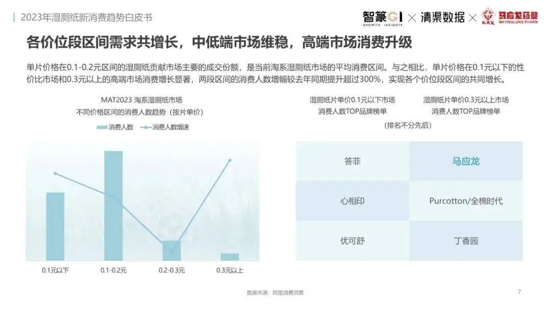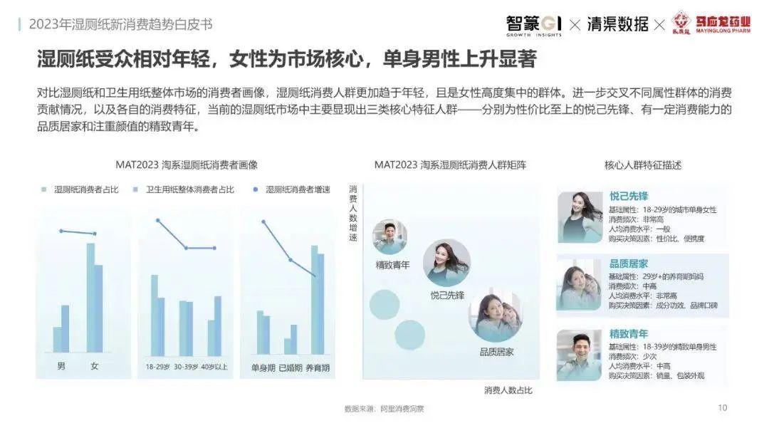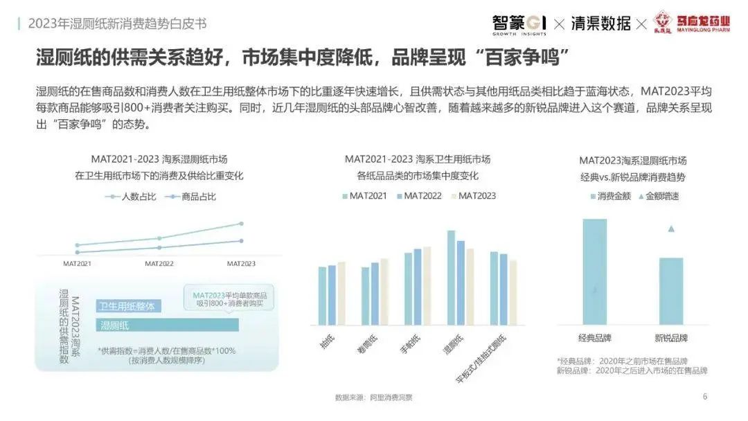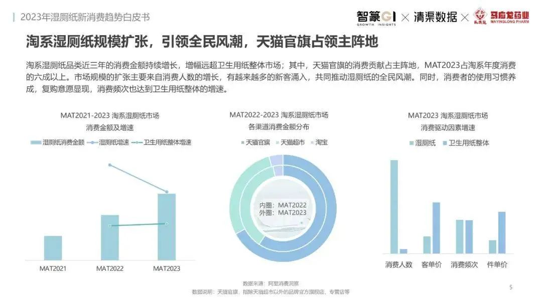 淘系濕廁紙品類(lèi)近三年的消費(fèi)金額持續(xù)增長(zhǎng),增幅遠(yuǎn)超衛(wèi)生用紙整體市場(chǎng),其中,天貓官旗的消費(fèi)責(zé)獻(xiàn)占主陣地,MAT2023占淘系年度消費(fèi)的六成以上,市場(chǎng)規(guī)模的擴(kuò)張主要來(lái)自消費(fèi)人數(shù)的增長(zhǎng),有越來(lái)越多的新客涌入,共同推動(dòng)溫廁紙的全民風(fēng)潮,同時(shí),消費(fèi)者的使用習(xí)慣養(yǎng)成,復(fù)購(gòu)意愿顯現(xiàn),消費(fèi)頻次也達(dá)到衛(wèi)生用紙整體的增速。