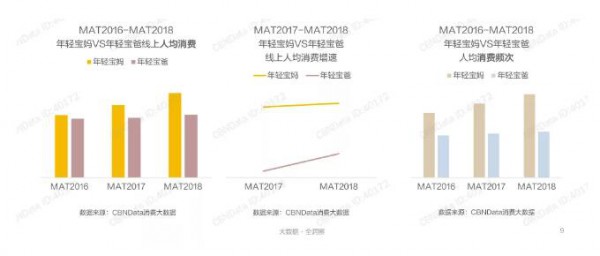 在更為開放、富足的環(huán)境下成長起來的80、90后年輕一代,大多受過良好的教育,生活水平也有所提高,他們在育兒觀念上更加開放,在包括紙尿褲在內(nèi)的眾多母嬰用品上,年輕寶爸寶媽更舍得花錢,他們有強(qiáng)烈的消費(fèi)意愿,還具備足夠的支付能力,成為母嬰消費(fèi)市場的中堅(jiān)力量。數(shù)據(jù)顯示,近年來,年輕寶媽寶爸的線上人均消費(fèi)逐年提升。相比寶爸,寶媽的增速更快,達(dá)到兩位數(shù)的高速增長,消費(fèi)潛力巨大。從消費(fèi)頻次來看,年輕寶媽更愛剁手,他們的消費(fèi)頻次遠(yuǎn)高于寶爸。